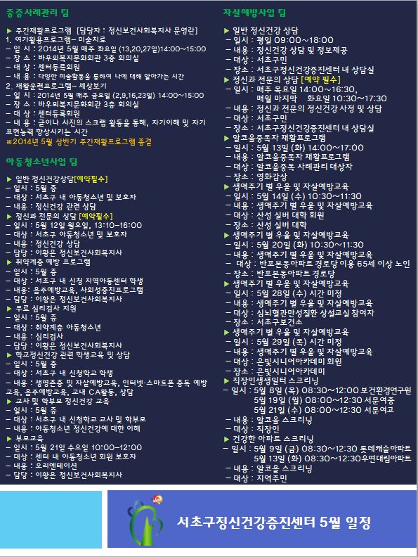 2014년 5월 서초구정신건강증진센터 일정입니다.