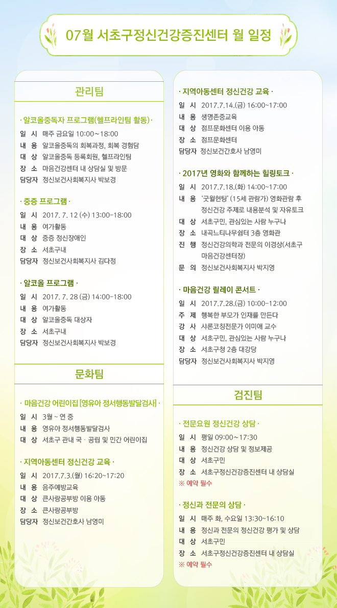 | 업로드 #1 | 서초구정신건강증진센터_7월홍보.jpg (371,090 byte) | ||