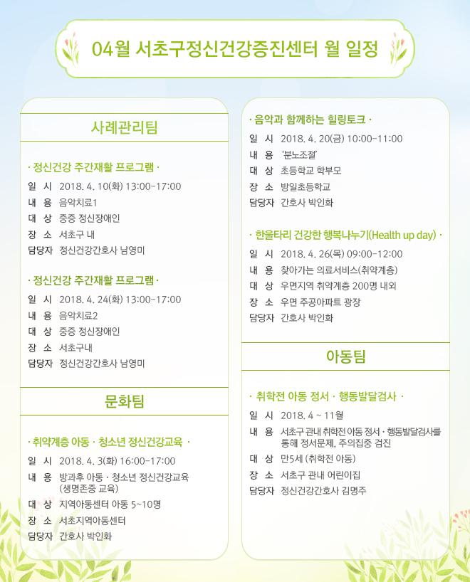 | 업로드 #1 | 서초구정신건강증진센터_4월홍보.jpg (243,027 byte) | ||